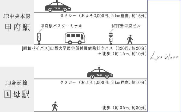 タクシーやバスをご利用の場合は、以下のサイトをご確認くださいませ。タクシーサイト(料金を調べる)やまなしバスコンシェルジュ